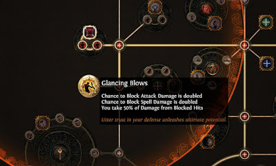 注意点としてChance to Blockには上限値75%が設定されているので37%を超えるchance to blockを持っている場合にはGlancing Blowsを取得すると受けるダメージ期待値が上がるので注意が必要です